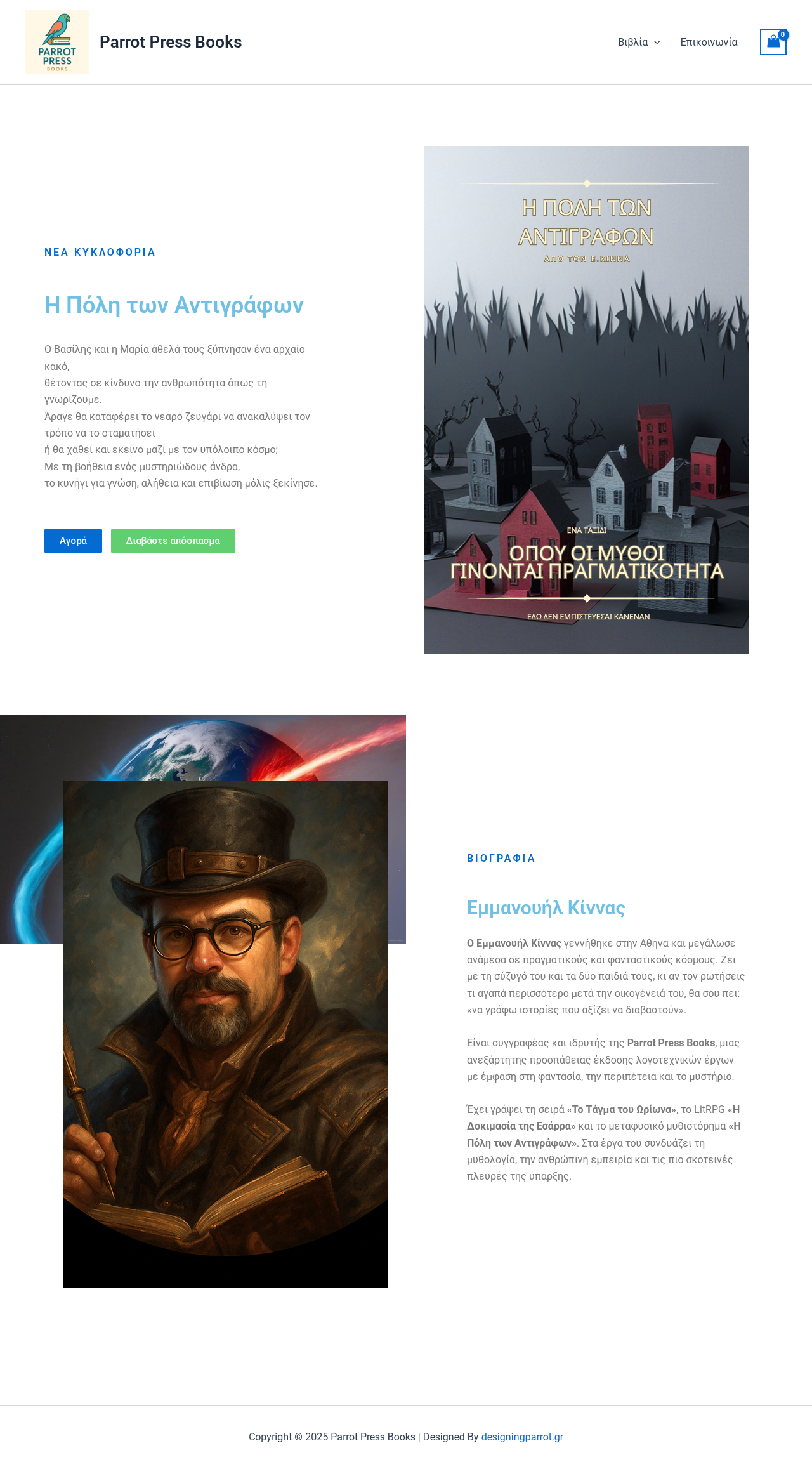 Πίσω από το Parrot Press Books βρίσκεται η ομάδα της DesigningParrot.gr, με πάνω από 16 χρόνια εμπειρίας στο web design, το digital marketing και το graphic design. Αυτή η τεχνογνωσία μας επιτρέπει να στηρίζουμε τους συγγραφείς με τρόπο επαγγελματικό αλλά και ανθρώπινο.